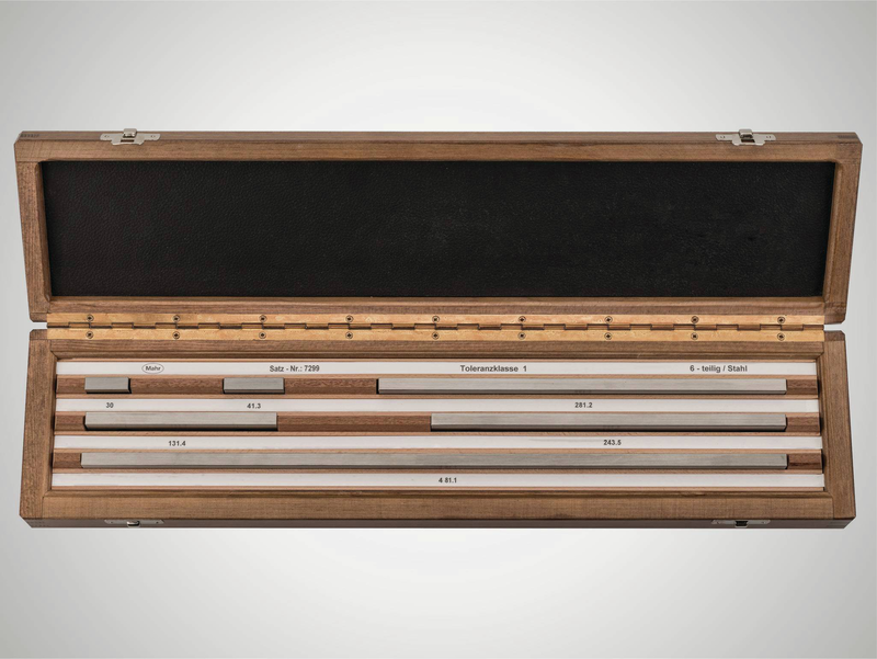 Caixa de madeira com faixa de inscrição visível, Certificado de calibração Mahr
